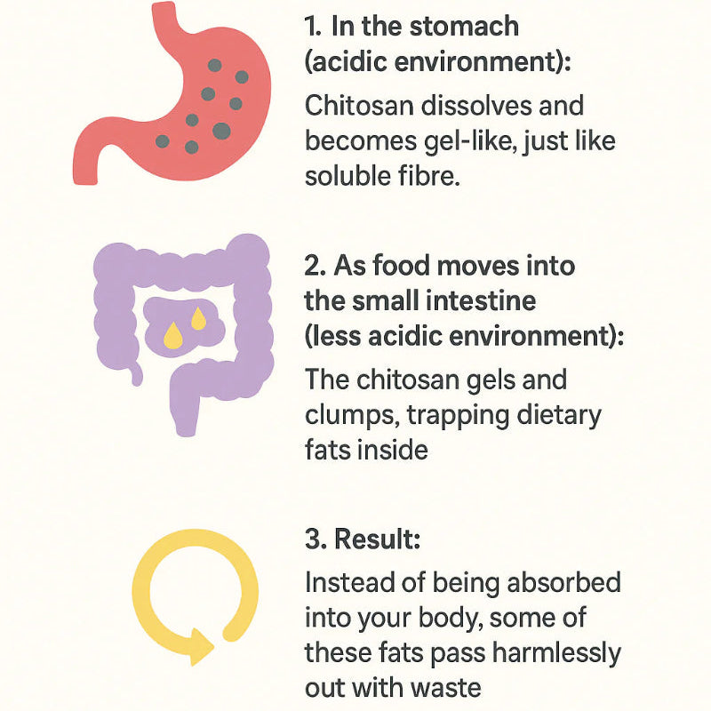 Chitosan is a natural amino-polysaccharide, chemically similar to cellulose but with a positively charged (cationic) structure, unlike most dietary fibers. In the acidic environment of the stomach, it becomes soluble and viscous—behaving like a soluble fiber.